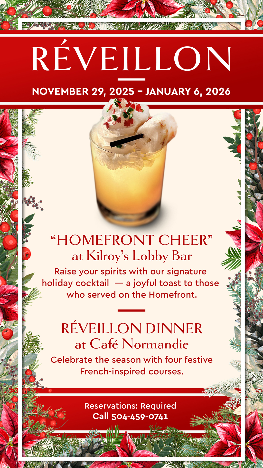 Join us Nov 29, 2024 through Jan. 6, 2025 on Fridays, Saturdays, Sundays and Mondays in Café Normandie for our popular prix-fixe Réveillon Dinner. Our four-course menu showcases a choice of exceptionally decadent dishes – including House-cured Absinthe Wild Salmon, Pan-seared Venison with Sauteed wild mushrooms, and a remarkably mouthwatering Poached Pear and Endive Salad! – culminating with a traditional Christmas Yule Log Cake.