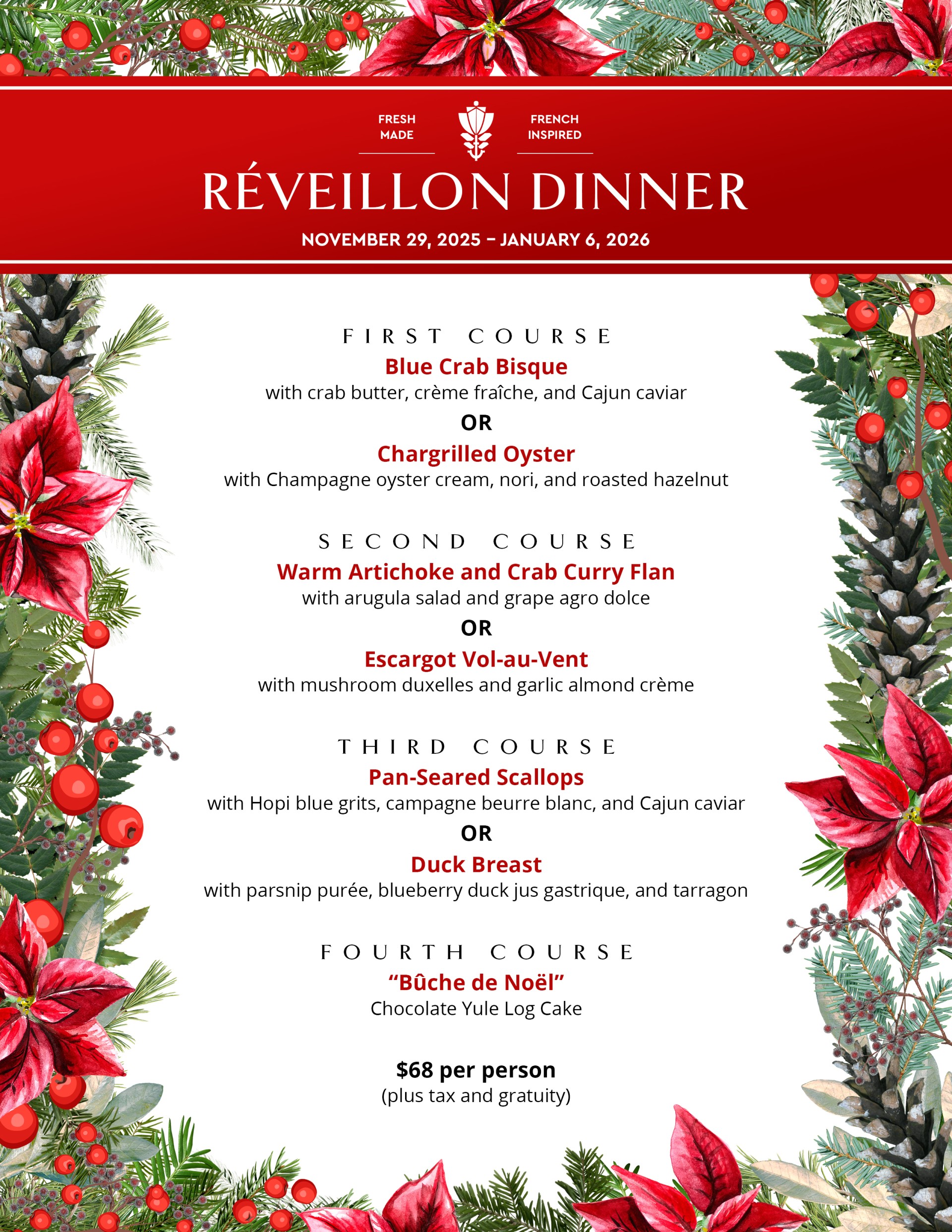 We invite you to experience one of the city’s most treasured holiday celebrations: the traditional Réveillon Dinner. The origin of our four-course Christmas feast dates back to the early 1800s, when Creole families marked the start of the Christmas season with a long and festive late-night supper.